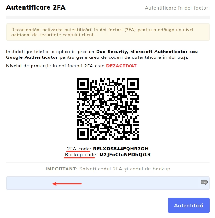 Kun olet konfiguroinut sovelluksen, 2FA-aktivoinnin loppuun saattamiseksi sinun on syötettävä sovelluksen tuottama ensimmäinen 6-numeroinen koodi alla olevan kuvan punaisella nuolella osoitettuun kenttään.