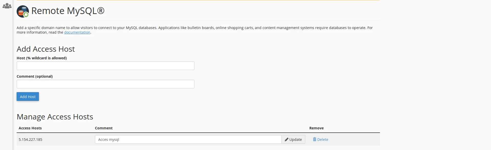 - Seuraavalla sivulla lisäämme IP-osoitteen, josta yhteys MySQL:ään muodostetaan, kommentti tai kuvaus on valinnainen, ja sitten napsautamme Lisää isäntä -painiketta toimenpiteen loppuunsaattamiseksi.