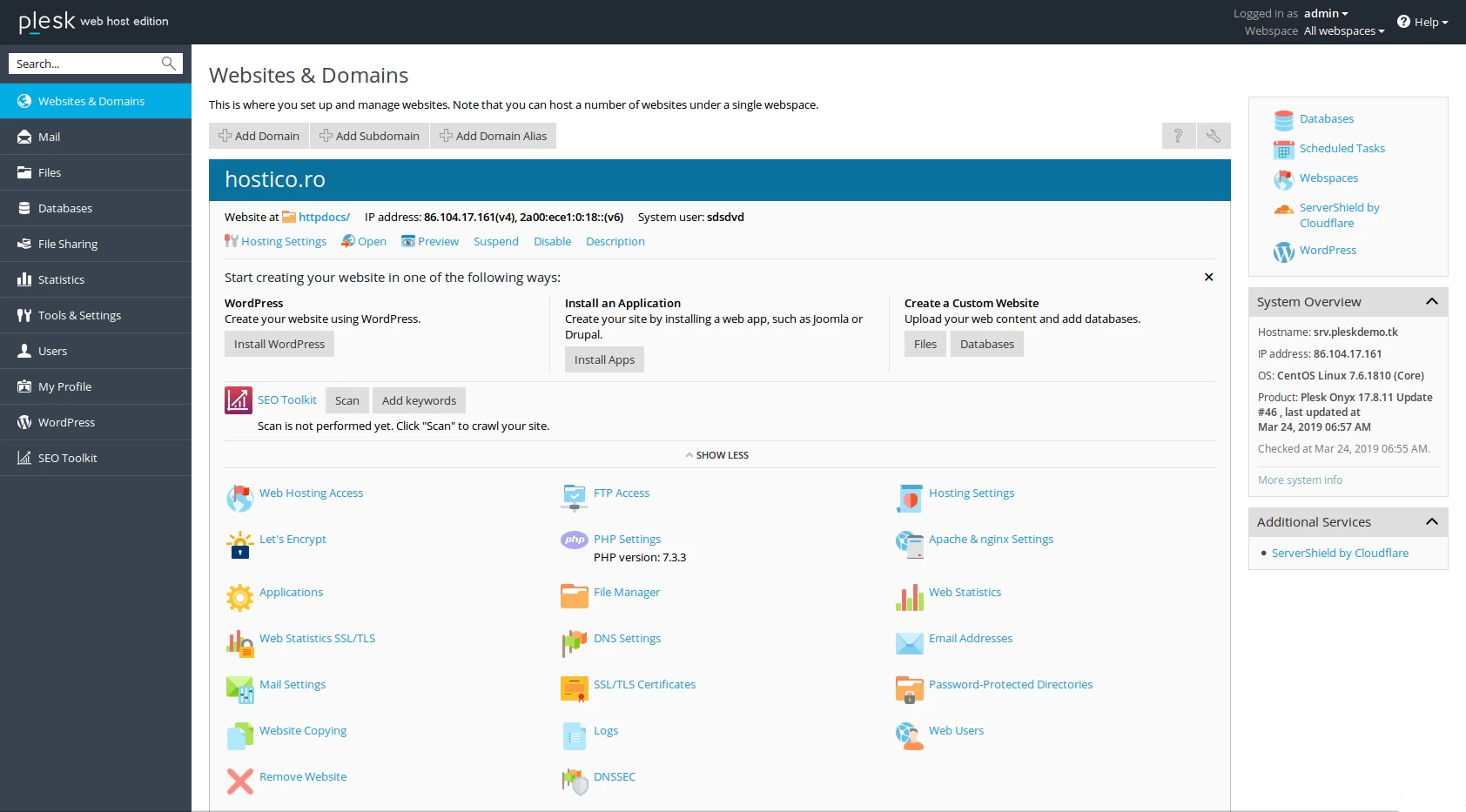 Plesk-käyttöliittymä on sama riippumatta valitusta lisenssityypistä, ero on vain siinä, kuinka monta verkkotunnusta voidaan lisätä ohjauspaneeliin.